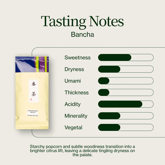 El sabor del té verde bancha es un poco más suave y terroso en comparación con sus contrapartes más jóvenes. Se pueden apreciar notas de madera, cereales e incluso cítricos. Las notas amaderadas provienen de los tallos más viejos y gruesos que se utilizan en el té bancha, que incluso tienen un poco de corteza.