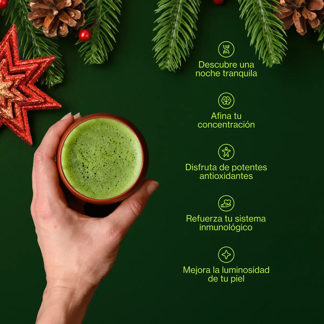El matcha está repleto de potentes antioxidantes, cafeína natural y aminoácidos calmantes que proporcionan energía sostenida, claridad mental y una sensación de concentración tranquila. Favorece el bienestar general, estimula el metabolismo y promueve un sistema inmunológico saludable, lo que lo convierte en el complemento perfecto para tu rutina diaria o ritual vacacional.